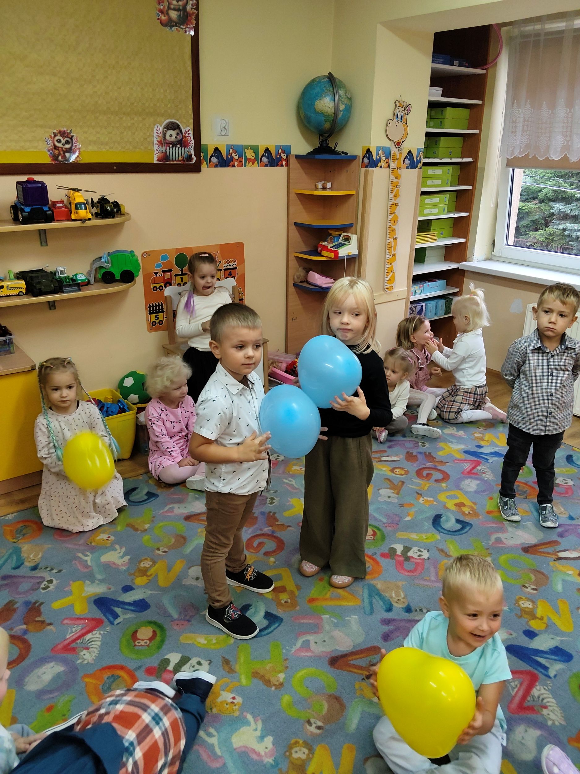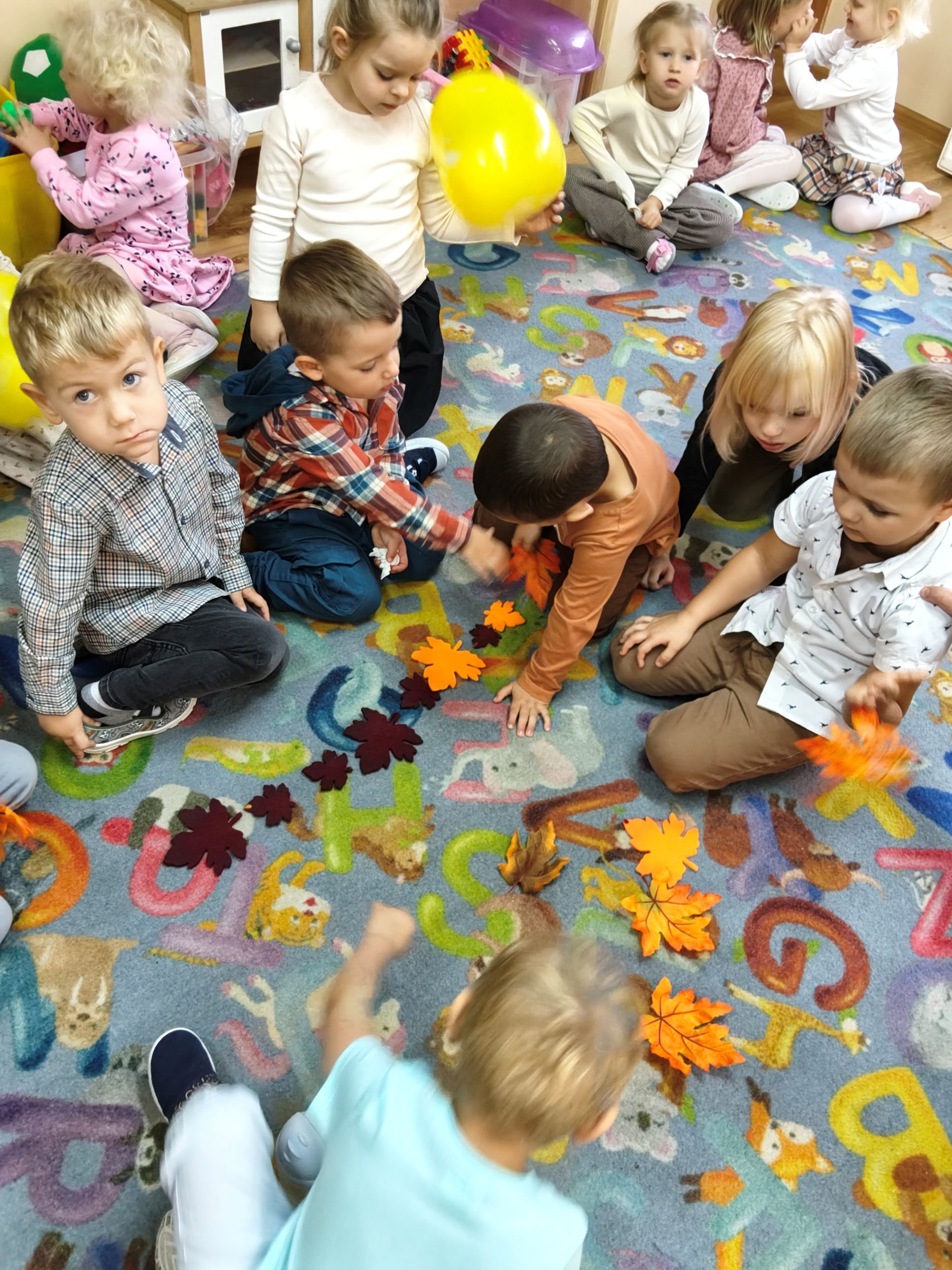 Wszyscy brali udział w zabawach muzycznych z balonami i jesiennym listkami.