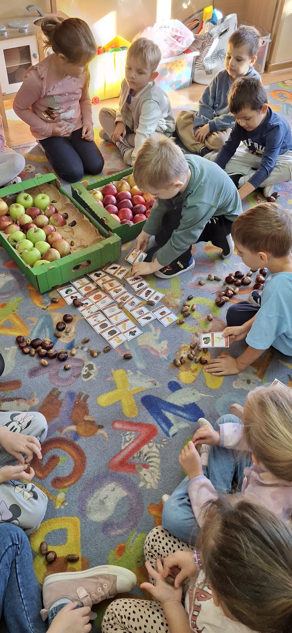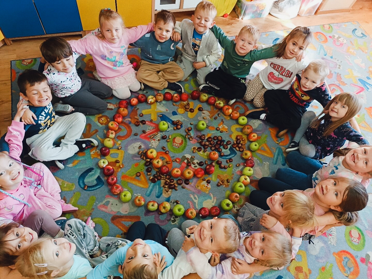 Przedszkolaki rozwiązywały zagadki związane z jabłkami, uczyły się rozpoznawać i segregować jabłka według odmian oraz tworzyły ciekawe wzory i kompozycje z jabłek i innych darów natury. Było przy tym mnóstwo śmiechu i kreatywności!