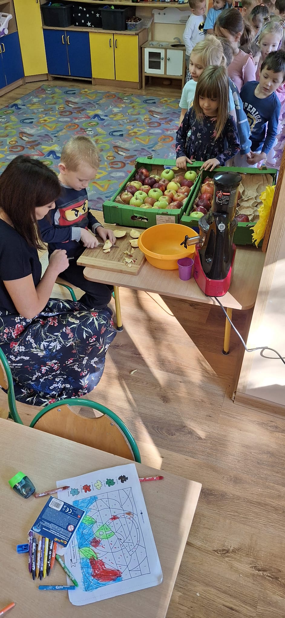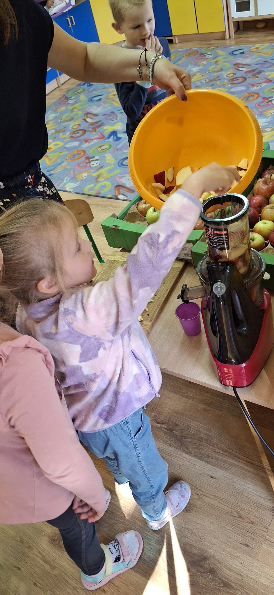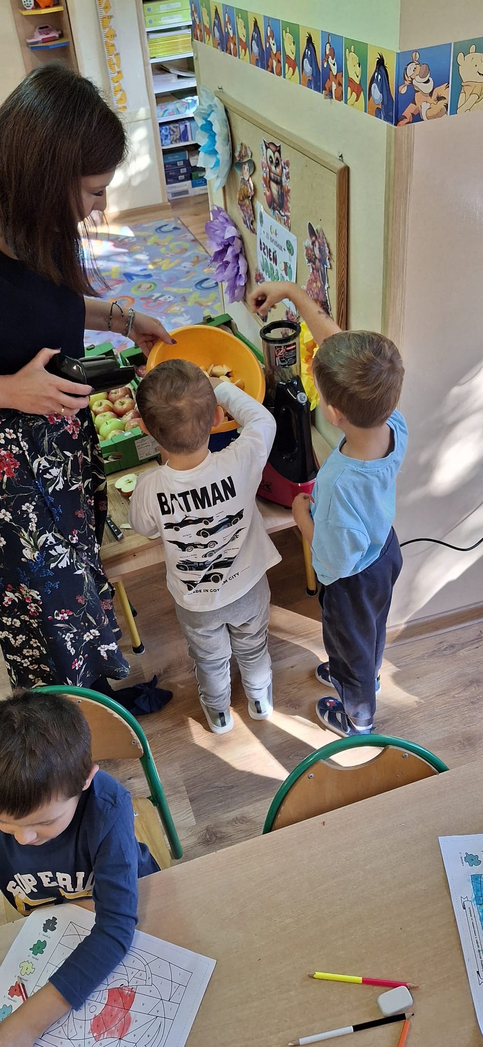 Pod czujnym okiem wychowawcy dzieci pokroiły jabłka i samodzielnie przygotowały z nich sok, który z apetytem wypiły podczas wspólnego poczęstunku. To była nie tylko doskonała zabawa, ale też okazja do rozmowy o zdrowym odżywianiu i znaczeniu owoców w naszej diecie.