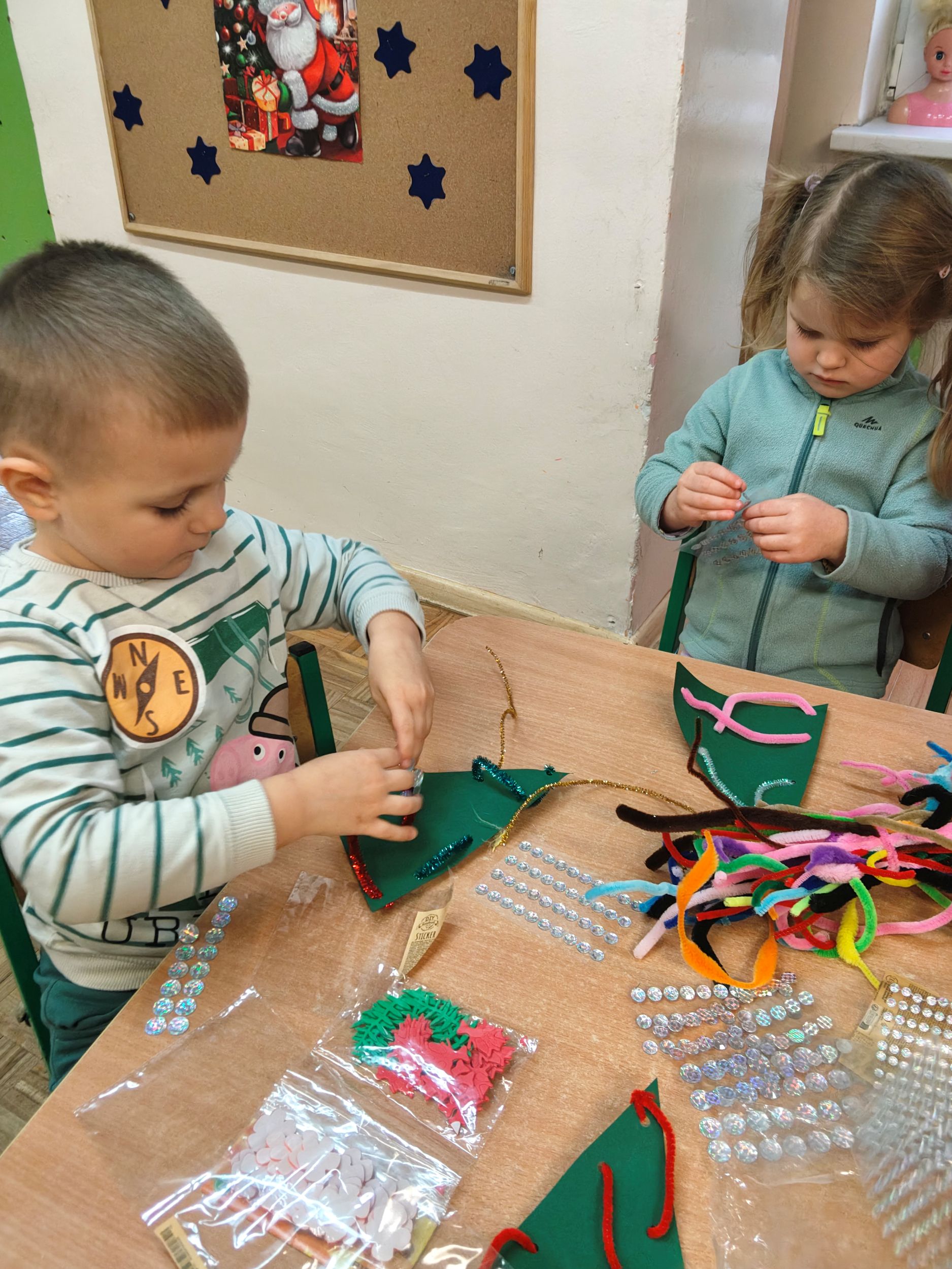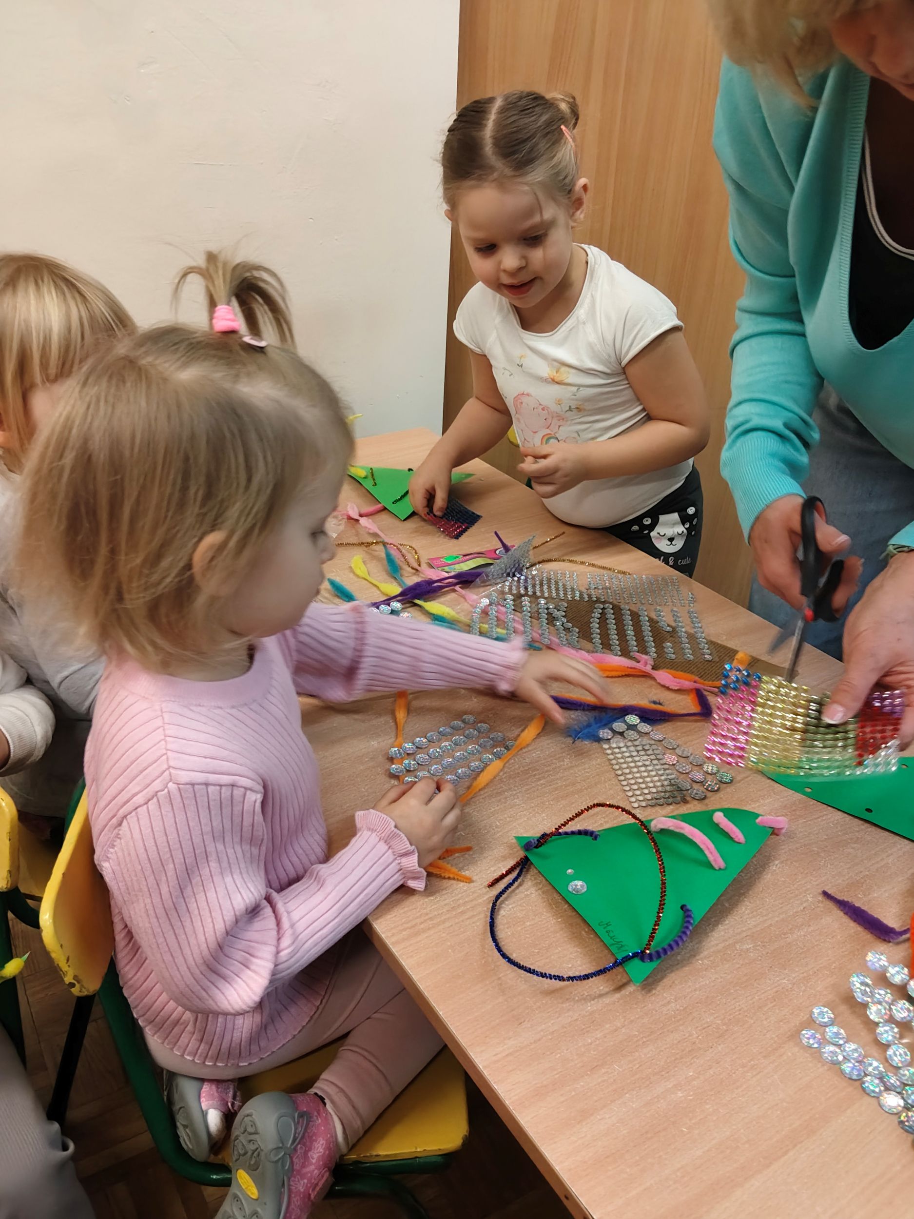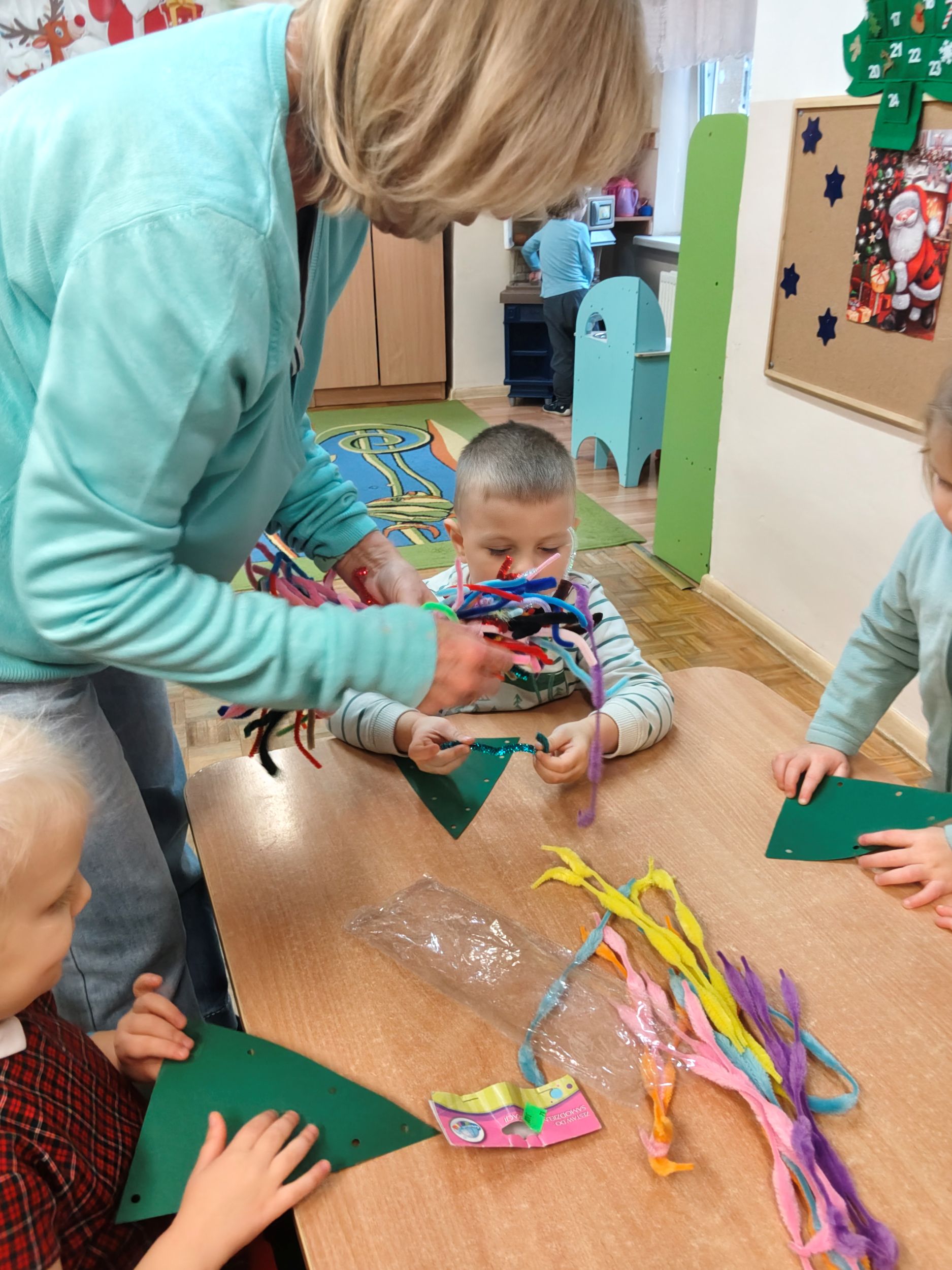 Na początku grudnia w grupie 3-, 4- latków odbyły się świąteczne warsztaty plastyczne, które poprowadziła pani Bożena Gajda z Miejskiego Centrum Kultury. Dzieci ozdabiały papierowe choinki świątecznymi materiałami dekoracyjnymi.