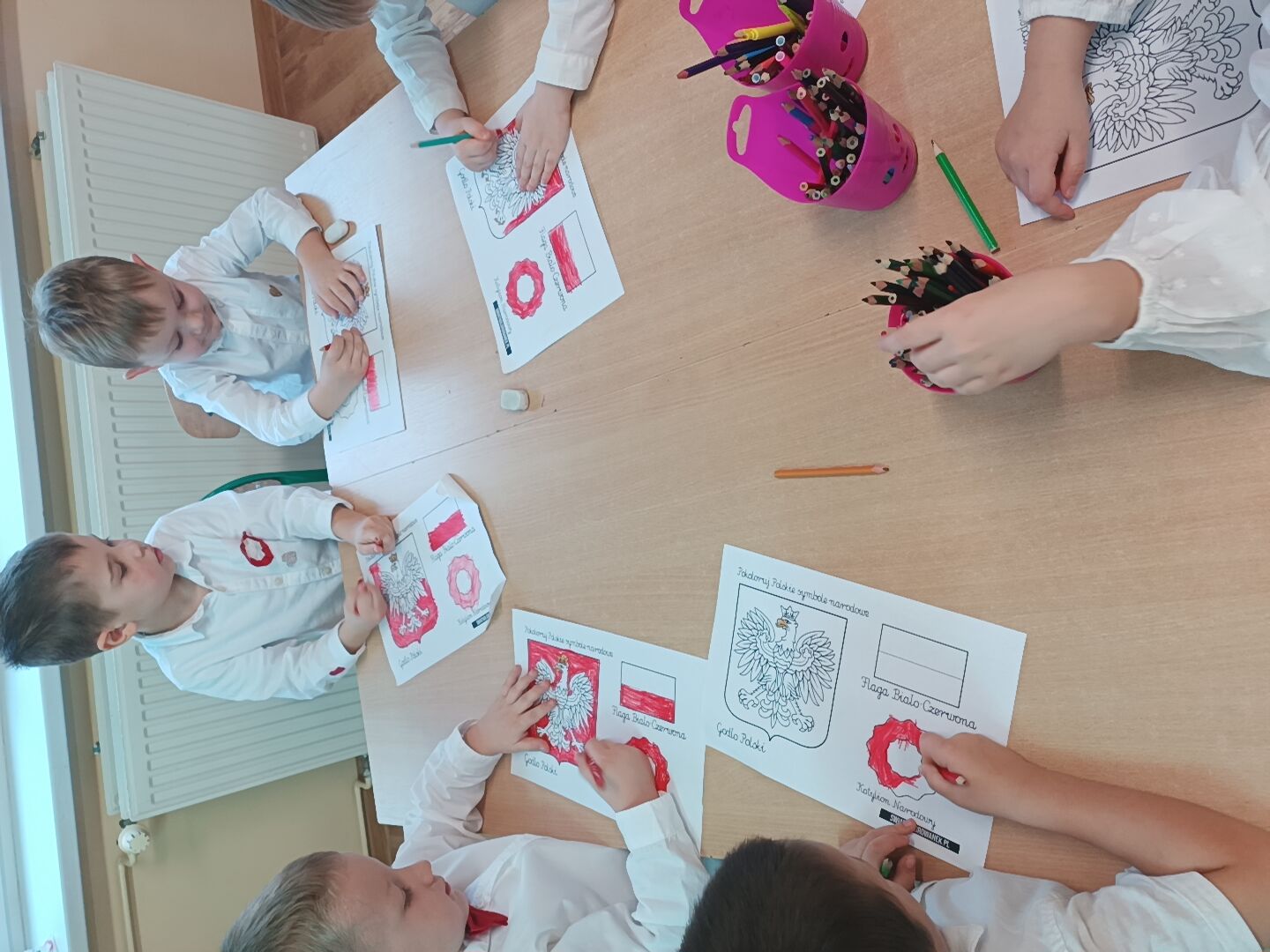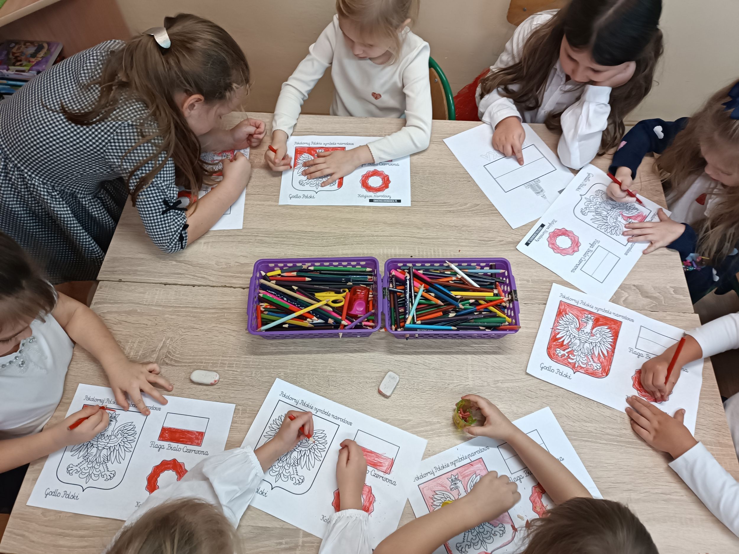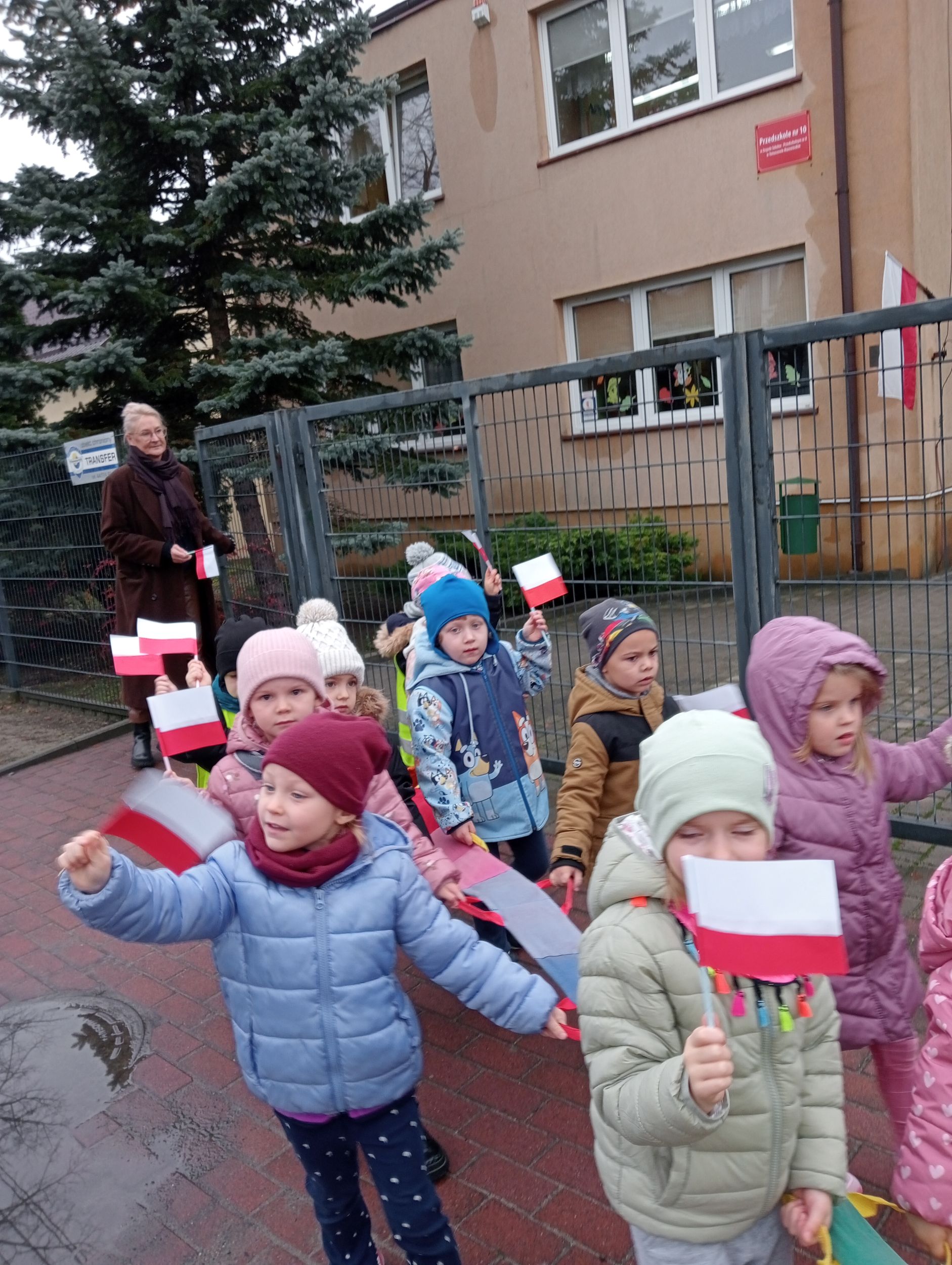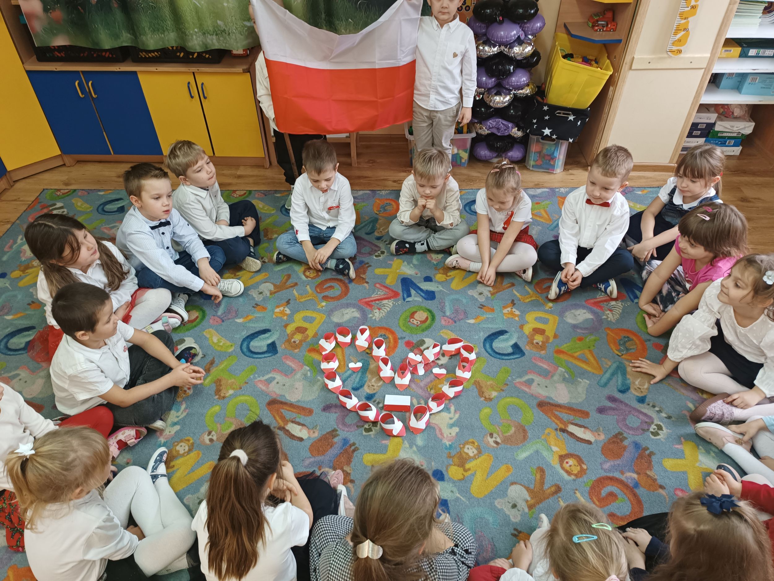 Dzieci z grupy „Jeżyki” również podeszły do uroczystości bardzo odpowiedzialnie. Przedszkolaki, odświętnie ubrane, z dumą odśpiewały hymn Polski. Następnie zaprezentowały wiersz Władysława Bełzy „Katechizm polskiego dziecka”, przypominając wszystkim, czym jest miłość do ojczyzny i jak ważne są patriotyczne wartości. Dzieci z wielkim zaangażowaniem uczestniczyły w zajęciach tworząc piękne godła i kotyliony, i udowadniając, że nawet najmłodsi potrafią pięknie uczcić pamięć o odzyskaniu przez Polskę niepodległości.