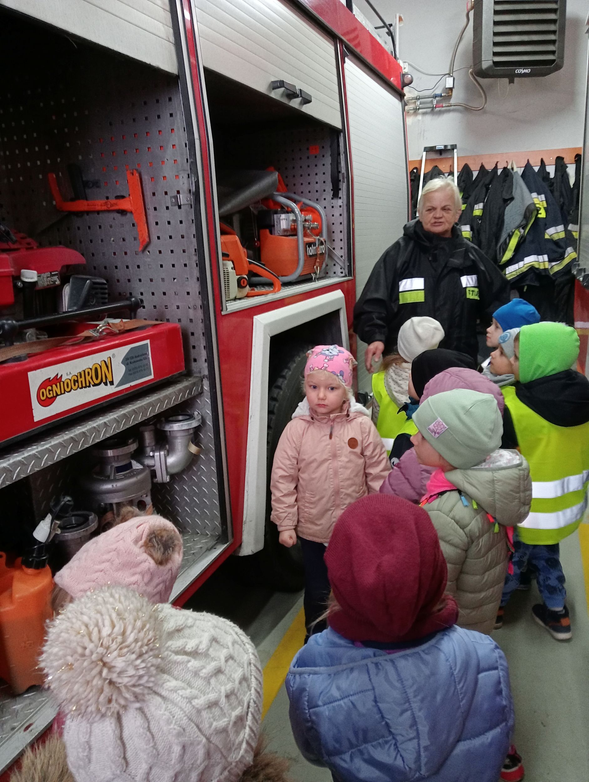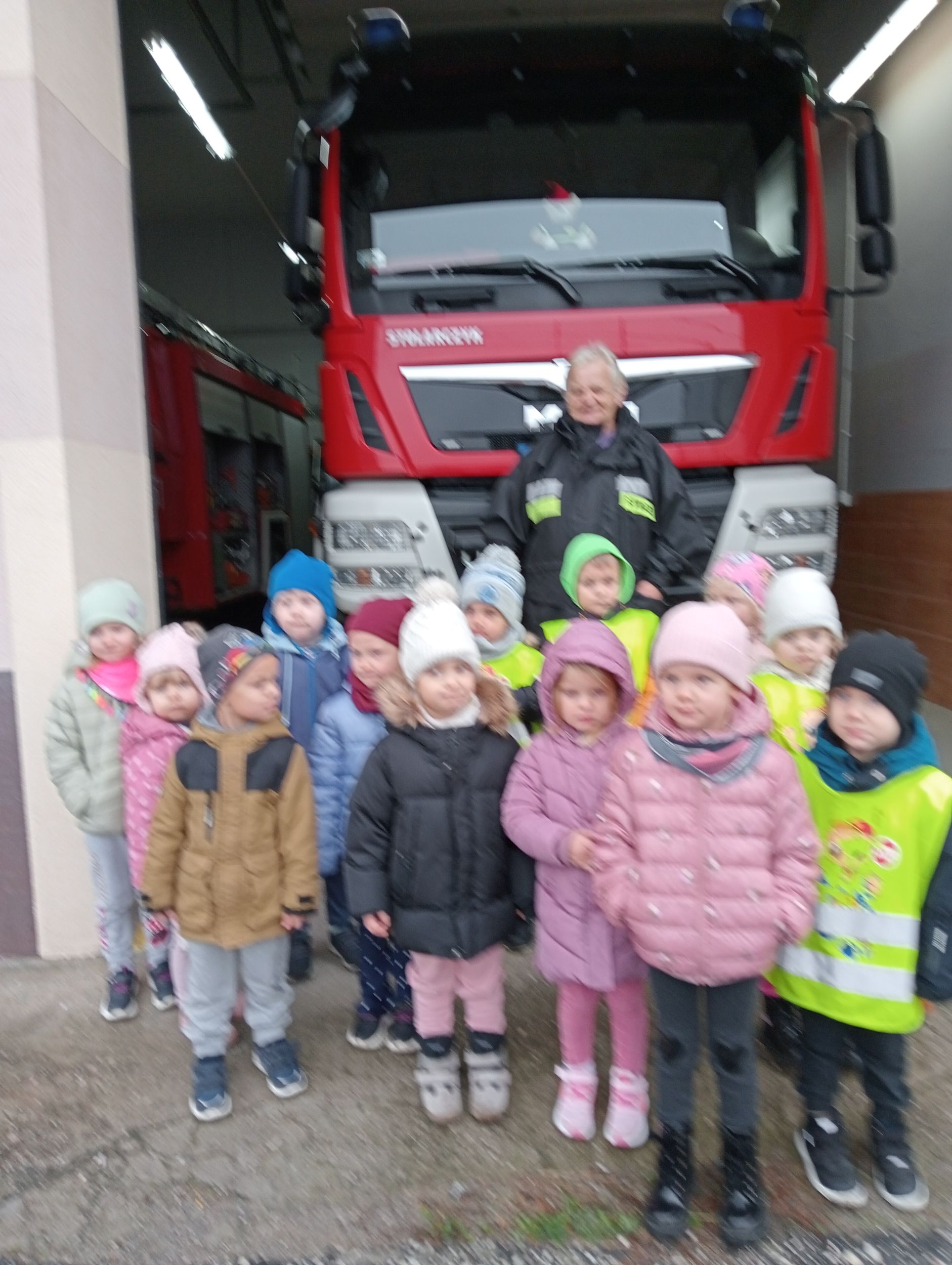 12 listopada dzieci z grupy 3-, 4- latków odwiedziły remizę strażacką Ochotniczej Straży Pożarnej w dzielnicy Białobrzegi, aby poznać tajniki pracy strażaków. Przedszkolakom o pracy tych odważnych ludzi opowiadała dh. Alicja Puchalska. Największe zainteresowanie wzbudziły jednak wozy strażackie i ich wyposażenie, które dzieci mogły obejrzeć od środka.